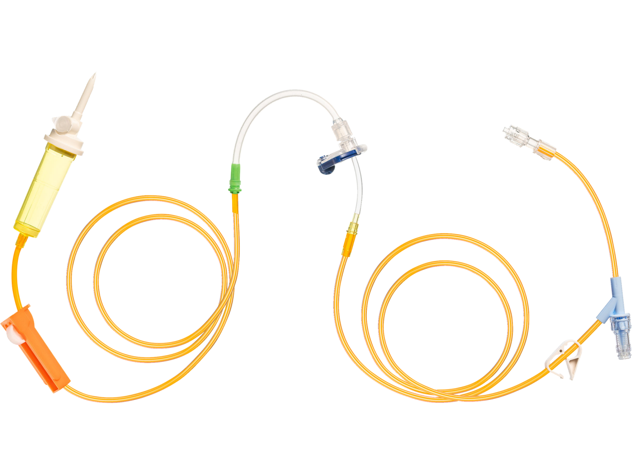 Oncology lines for oncological infusion therapy. Oncology lines have multiple configurations (e.g., upper needle-free access) to accommodate various patient needs.