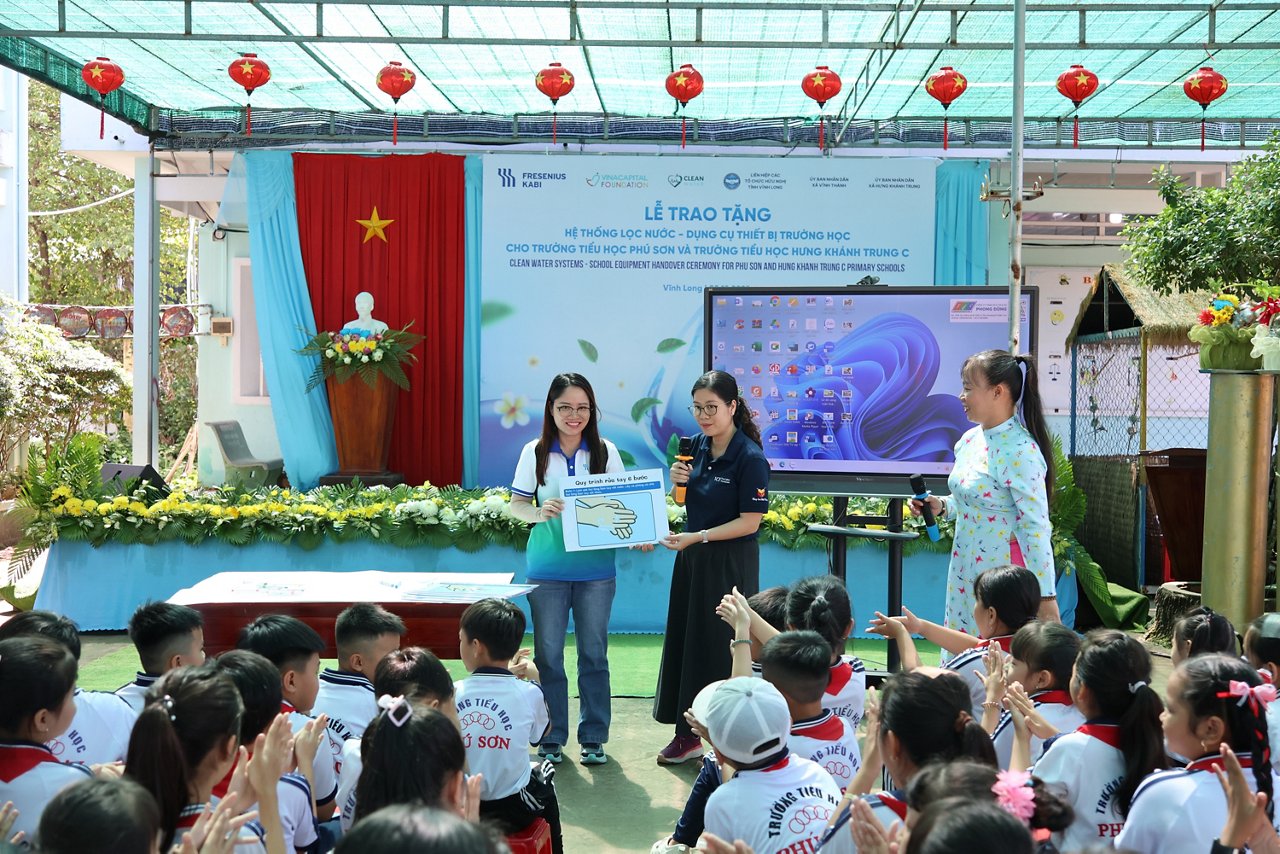 Trong khuôn khổ lễ bàn giao, các thành viên của Fresenius Kabi Việt Nam đã trao tặng những phần quà chăm sóc sức khỏe cho trẻ em và tổ chức các buổi hướng dẫn vệ sinh cá nhân ngoài trời đầy sinh động, gần gũi. Để ghi nhận sự nỗ lực của các em, mỗi em nhỏ đều nhận được một món quà đặc biệt trước khi ra về, góp phần tạo nên một sự kiện vừa giàu ý nghĩa nhân văn, vừa đáng nhớ đối với các em và cộng đồng.